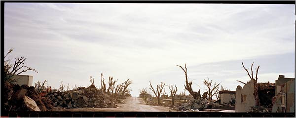It is evening in Greensburg, and the little left standing casts long shadows. The volunteers return their rakes and the claws of demolition take their last few swipes, while strong breezes from the south blow through the deserted streets to create phantom movement.
